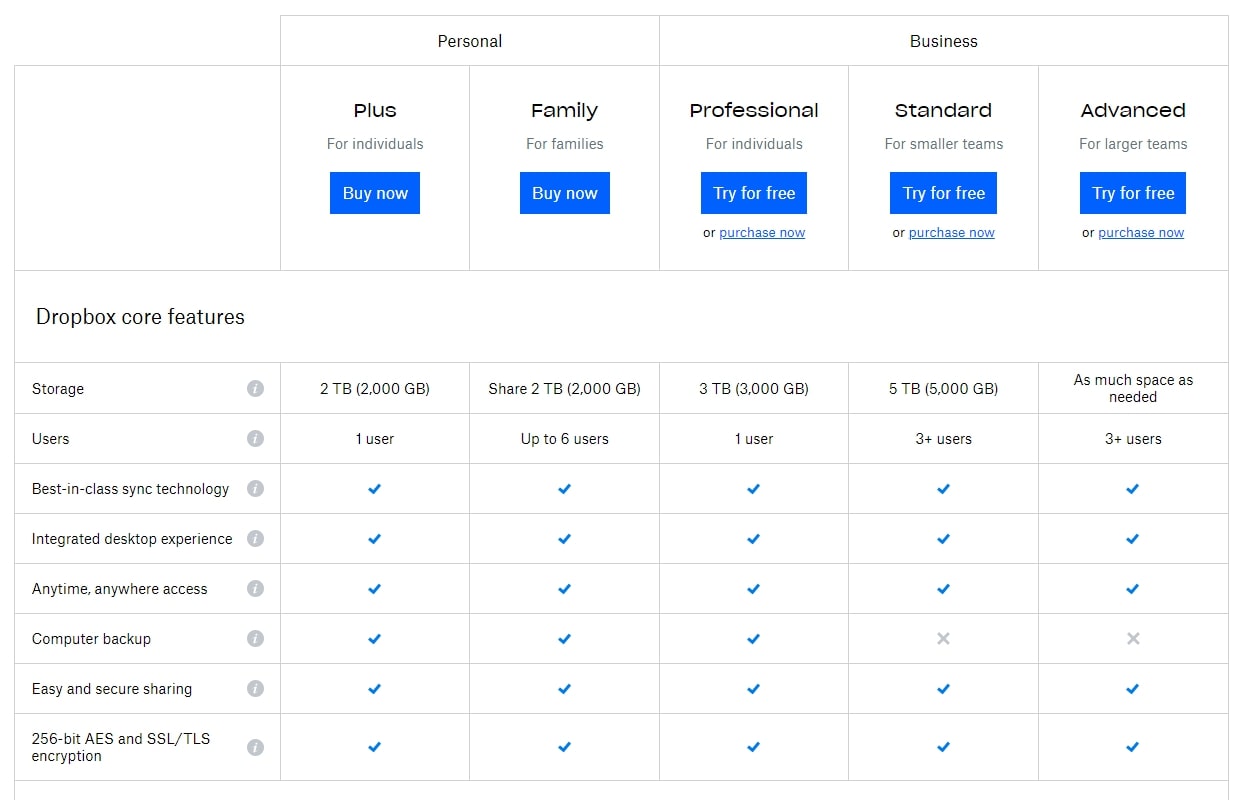 Dropbox'southward outset pricing tier is totally gratis. If yous won't use Dropbox for storing work files, and want to only utilise it occasionally, it's probable the 2GB of storage that's inclusive to the free program volition exist good enough. At that place are ii other personal levels and then three concern levels available.